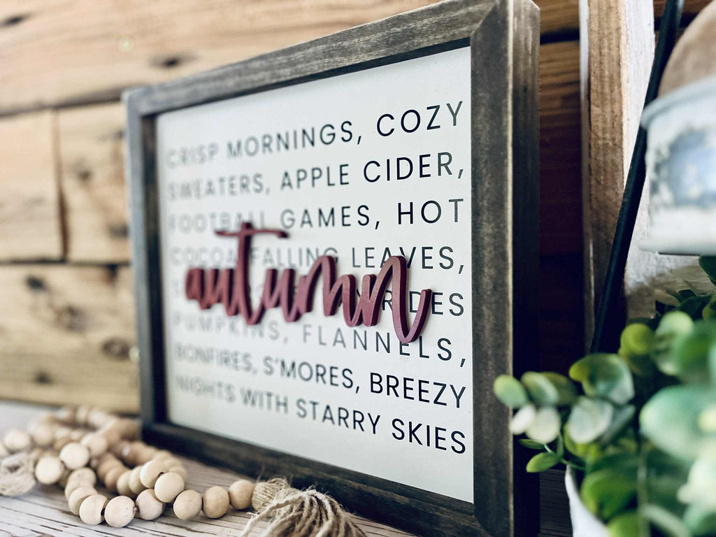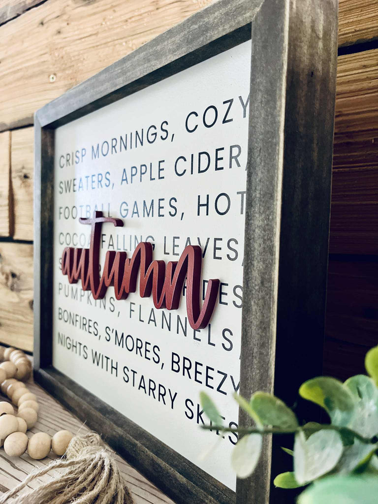 Autumn Farmhouse Sign – Raised Lettering Fall Décor with Cozy Word Collage