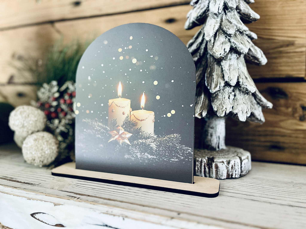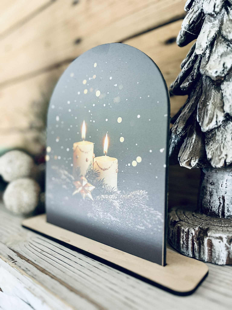 Add warmth and glow to your holiday home with this Christmas Candle Tabletop Sign. Featuring two glowing candles with greenery and golden accents, this freestanding piece is UV printed directly onto wood for crisp, lasting detail. The arched sign comes with a removable wooden base, making it easy to display on mantels, shelves, or tabletops.