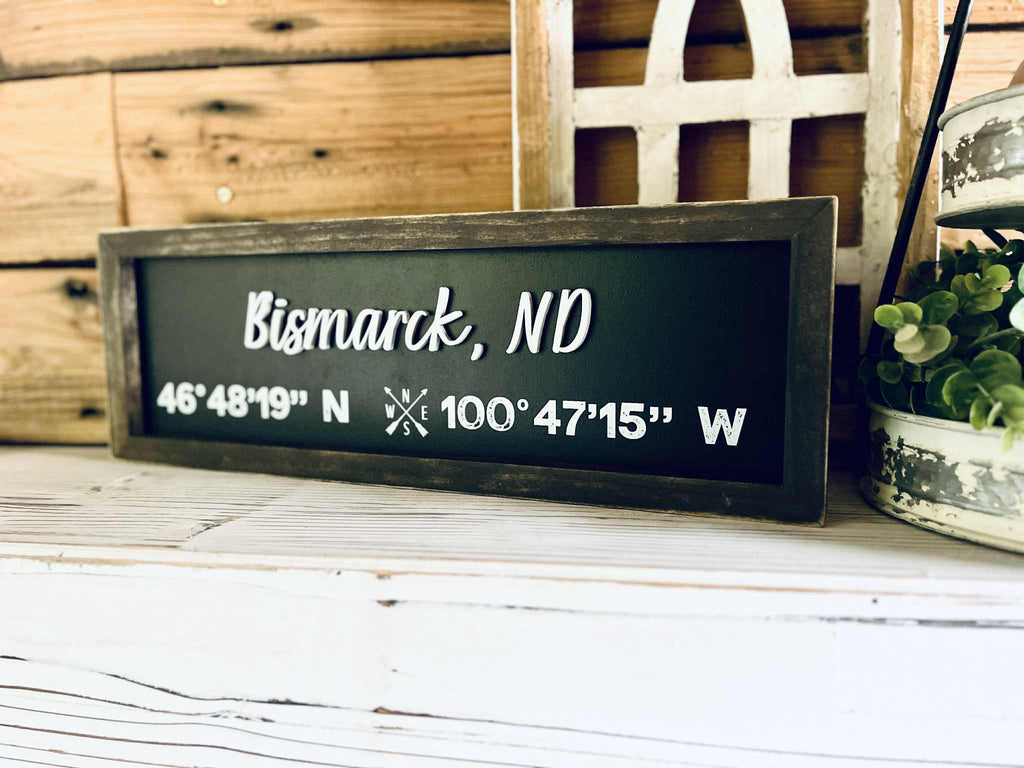 Celebrate your hometown, favorite travel destination, or a special place with this beautifully handcrafted custom city coordinate sign. Featuring raised lettering for the city name and UV-printed coordinates, this framed wooden sign blends modern precision with rustic farmhouse charm.