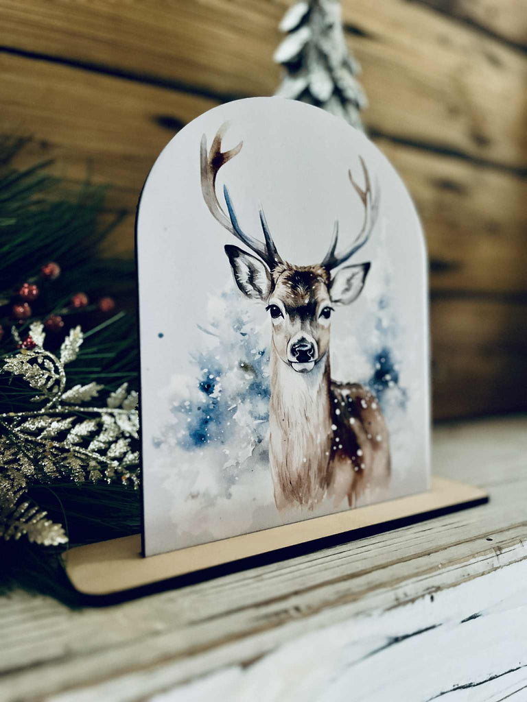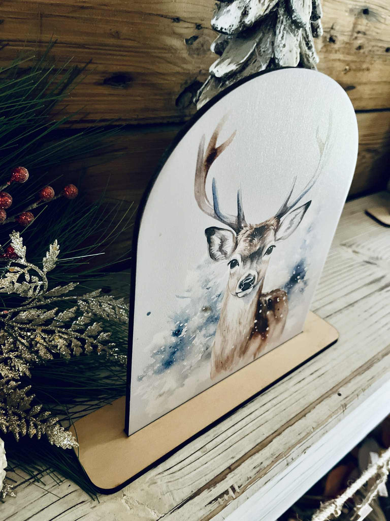 Add rustic woodland charm to your holiday home with this Deer Shelf Sitter. Featuring a detailed watercolor-style deer surrounded by snowy evergreens, this freestanding piece is UV printed directly onto wood for crisp, lasting detail. The arched sign comes with a removable wooden base, making it easy to display anywhere in your home.