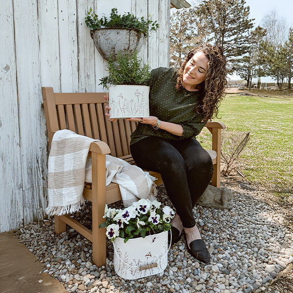 Rustic Cream Mushroom Embossed Metal Buckets, Set of Two