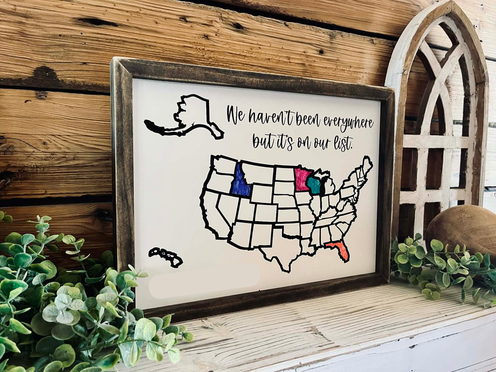 Whether you're planning your next road trip or celebrating where you've already been, this interactive travel sign allows you to color in the states with Sharpie as you visit each one!